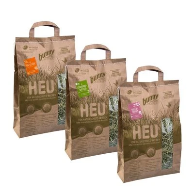 A diverse set of 3 varieties of hay ideal for rabbits and small pets. It contains unique plants and herbs from nature conservation meadows, gently warm air-dried and offering delicious highlights.