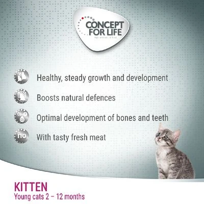 The basis of a long and active cat life is a species-appropriate, balanced nutrition. In order to grow into a healthy adult cat your kitten needs the right food with all the important nutrients, vitamins and minerals. Concept for Life Kitten provides your young cat with a balanced diet that helps optimal development during the all-important growth period: the nutritional composition is formulated to suit the specific requirements of kittens and promotes health and well-being. This energy-rich dry food is packed with vitamins and minerals. The kibble is just the right size for young cats. It is also suitable for pregnant or lactating cats.