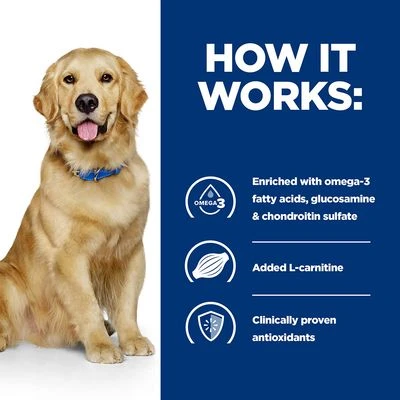 Hill’s Prescription Diet Canine j/d Joint Care with Chicken dry dog food has been formulated to provide nutritional support to dogs that suffer from reduced mobility and poor joint health. Canine mobility can start to decline as a result of ageing, excess weight or congenital defects.