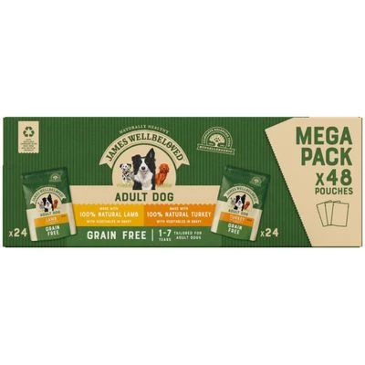 This James Wellbeloved Adult Grain Free Pouches – Variety Pack is the ideal way to support your dog’s health as well as providing flavour and excitement to every meal. It contains two delicious varieties of grain-free wet dog food, each containing a single source of animal protein combined with beneficial ingredients in an irresistible gravy. Both varieties, Turkey in Gravy and Lamb in Gravy, are naturally hypoallergenic, made without any troublesome ingredients such as grains, and use 100% natural meat.