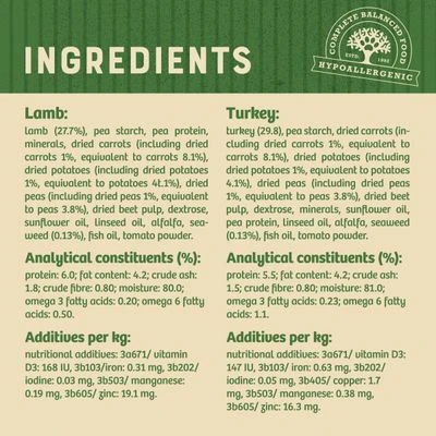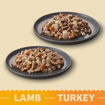 Naturally hypoallergenic, grain-free wet dog food in a handy variety pack, including delicious Turkey and Lamb varieties in a tasty gravy, with cranberry extract and single source animal protein.