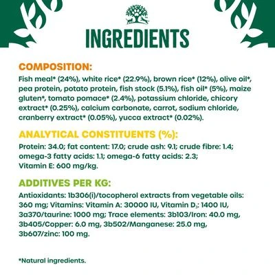 Analytical Constituents: protein 33.0%, crude fibres 1.5%, fat content 21%, crude ash 9.3%, Vitamin E 600mg/kg, omega-3 fatty acids 1.6%, omega-6 fatty acids 2.4%.