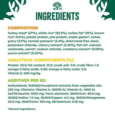 Analytical Constituents: protein 33.0%, crude fibres 1.2%, fat content 21%, crude ash 7.6%, Vitamin E 600mg/kg, omega-3 fatty acids 0.4%, omega-6 fatty acids 4.8%.