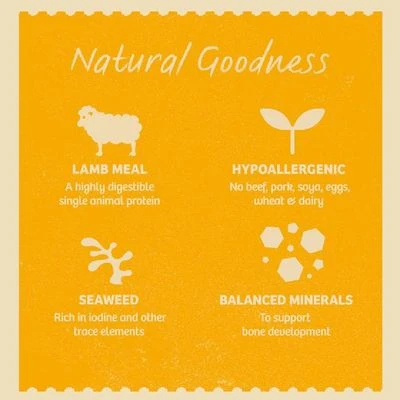 Lamb (31.2%), rice (4%), minerals, dried carrots (incl. 1% dried carrots, equivalent to 8.1% carrots), dried peas (incl. 1% dried peas, equivalent to 3.8% peas), dextrose, dried beet pulp, sunflower oil, linseed oil, alfalfa, seaweed (0.11%), fish oil, tomato powder.
