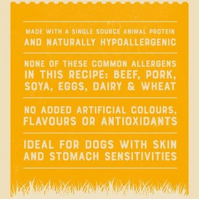 James Wellbeloved wet dog food contains no added artificial colours, flavours or preservatives, no beef, no pork, no wheat or wheat gluten, no dairy products, no egg and no soya.
