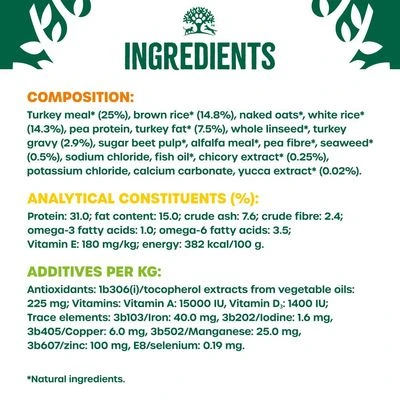 Turkey Meal (25.0%), Brown Rice (15.2%), White Rice (15.0%), Naked Oats, Pea Protein, Turkey Fat (7.2%), Whole Linseed, Turkey Gravy (2.9%), Sugar Beet Pulp, Alfalfa Meal, Pea Fibre, Seaweed, Sodium Chloride, Chicory Extract (0.25%),Omega Supplement*, Potassium Chloride, Calcium Carbonate, Yucca Extract, (0.02%).