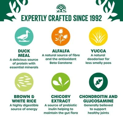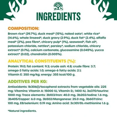 Brown Rice (39.7%), Duck Meal (15.0%), White Rice (14.6%), Naked Oats, Whole Linseed, Duck Gravy (2.9%), Duck Fat (2.4%), Alfalfa Meal, Pea Fibre, Chicory Pulp, Seaweed (0.5%), Omega Oil Supplement*, Potassium Chloride, Sodium Chloride, Parsley (0.125%), Nettles (0.125%), Taurine (0.1%), Chicory Extract (0.1%), Calcium Carbonate, Glucosamine (0.045%), Yucca Extract (0.02%), Chondroitin (0.005%).