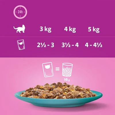 - More Variety! Whiskas portion pouches come in many different flavours, so that you can give your cat something different for every meal.