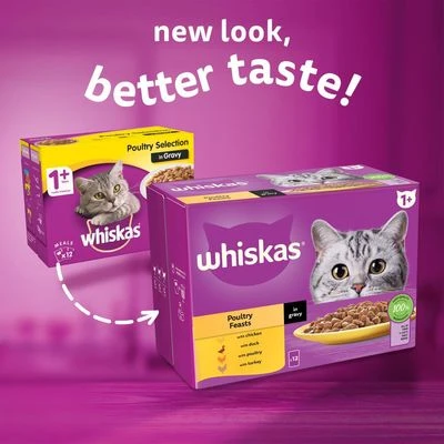 Whiskas Portion Pouches at a glance – freshness and variety for every meal: 1+ Poultry Feasts in Gravy now available as a handy Multi Buy!