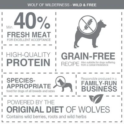 Wolf of Wilderness dog food reflects the feeding patterns of the wild wolf and ensures that your dog has a balanced intake of nutrients.